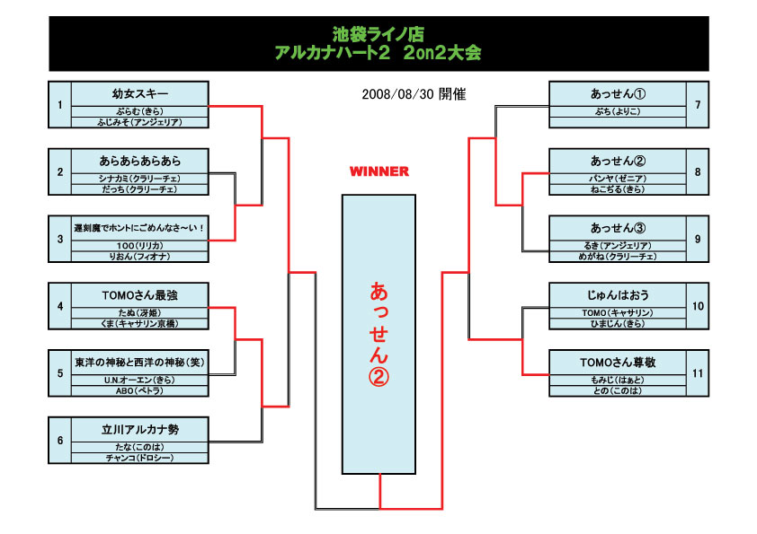 ah20830.jpg8月30日に行われましたアルカナハート2 2on2大会の結果です。
