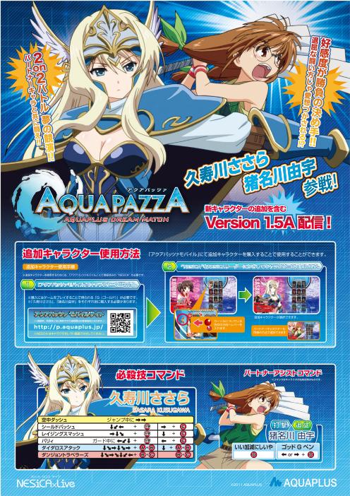 プレイヤーキャラクターとして「久寿川ささら」(ToHeart2 ダンジョントラベラーズ) パートナーキャラクターとして「猪名川由宇」(こみっくパーティー) が登場しました。 また、新規ステージ/ステージBGMの追加、ゲームバランスの調整等も行なわれています。 追加キャラクターは、「アクアパッツァ公式モバイルサイト」にて、 ゲーム内ポイントを消費し購入することで、ゲームでの使用権が得られます。