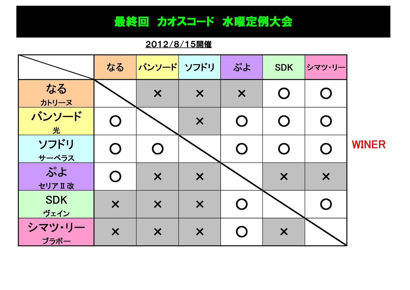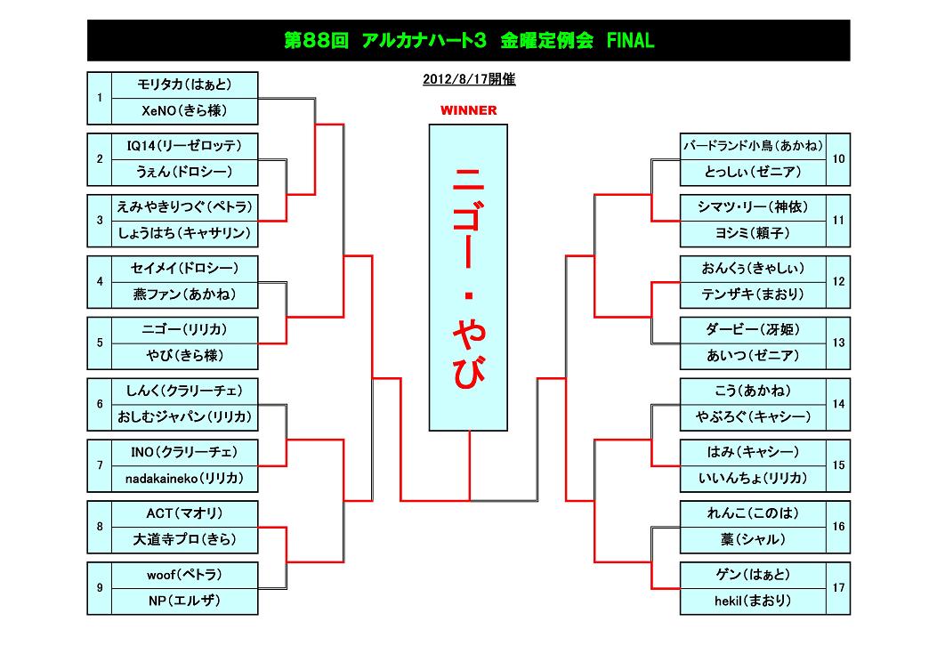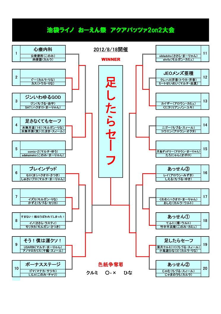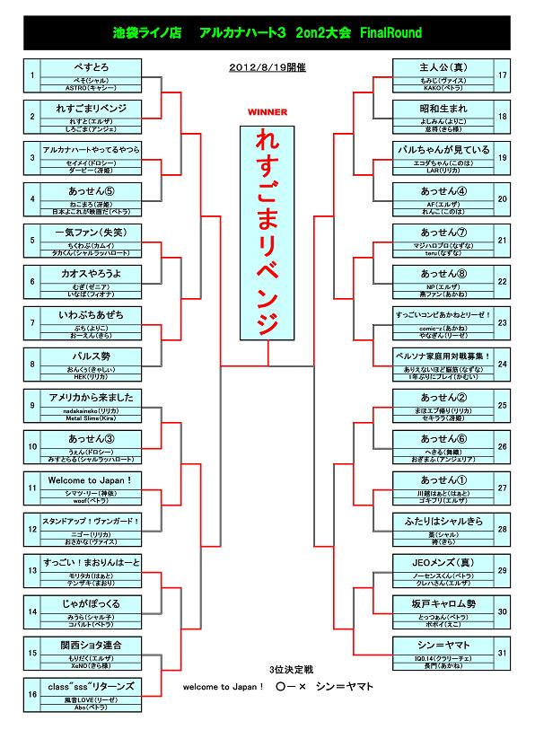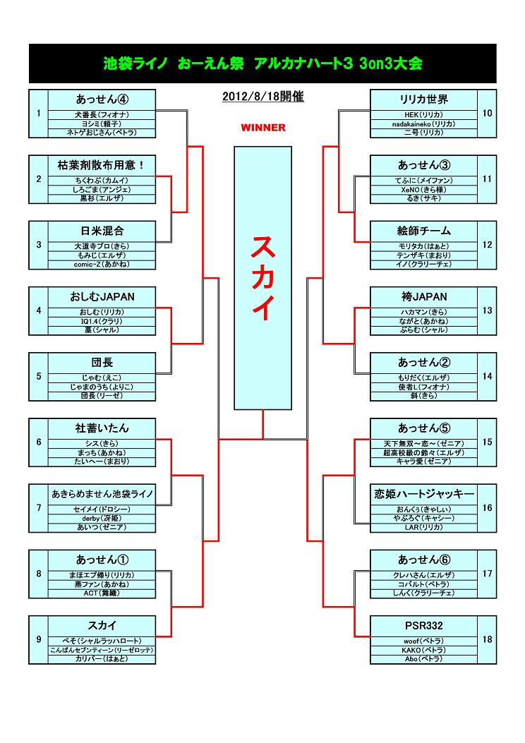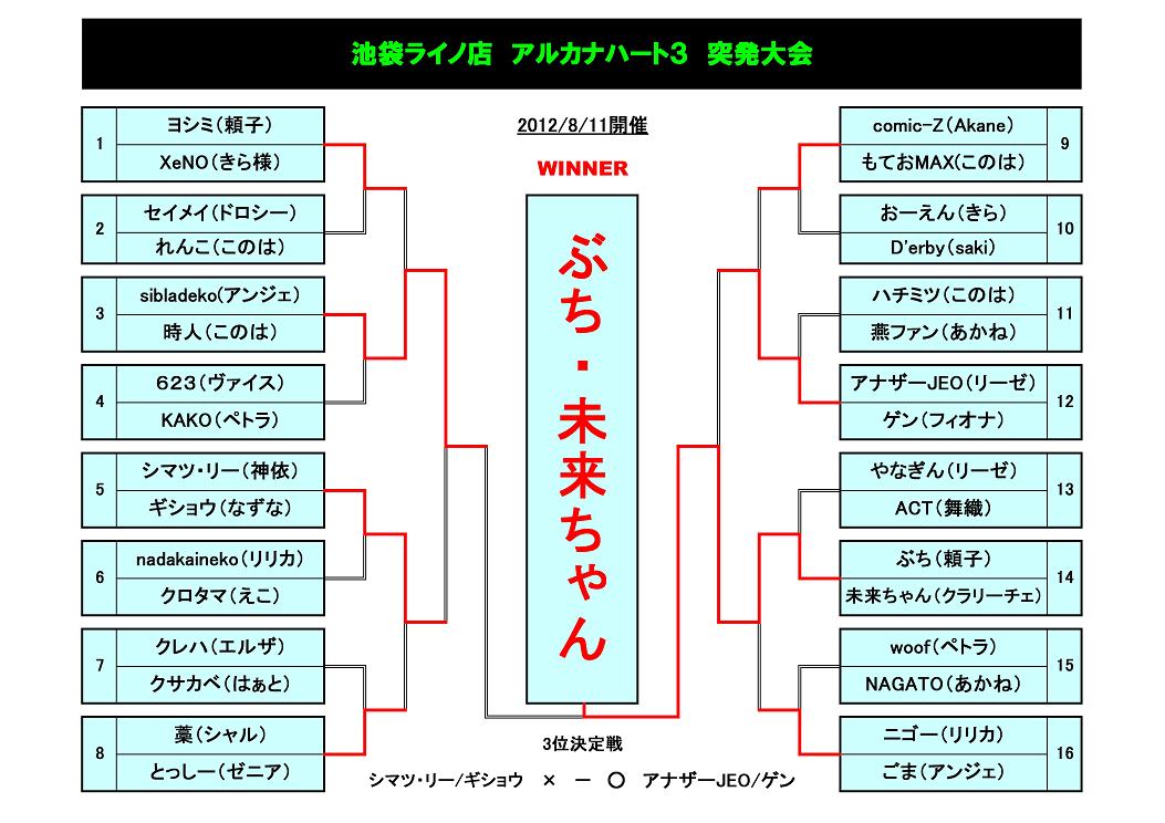 第1部 アクアパッツァ 参加者は40名、試合形式は2on2で行いました。 優勝 足したらセーフ 葉月クルミ(11)(ちづる・スィール) 小鳥遊ひな(3)(カルラ・理奈) 準優勝 足さなくてもセーフ 水無月遥(16)(モルガン・理奈) 水無月葵(笑)(環・スィール) 第2部 アルカナハート3 参加者は48名、試合形式は3on3で行いました。 優勝 スカイ ぺそ(シャルラッハロート) こんばんセブンティーン(リーゼロッテ) カリパー(はぁと) 準優勝 PSR332 woof(ペトラ) KAKO(ペトラ) ABo(ペトラ)