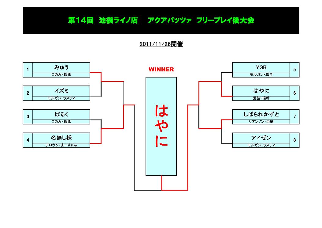 11/26に行なわれた、アクアパッツァ定額フリープレイ後大会の結果です。