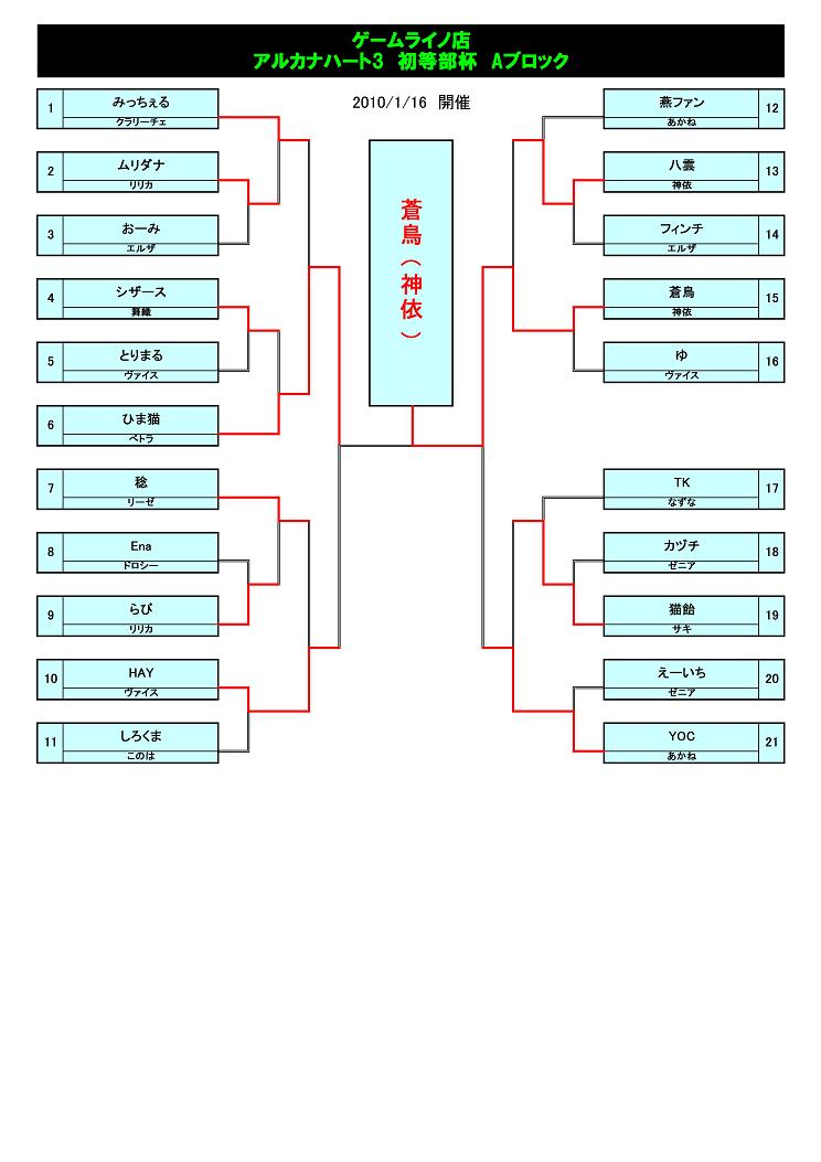 × [PR]上記の広告は3ヶ月以上新規記事投稿のないブログに表示されています。新しい記事を書く事で広告が消えます。 アルカナハート3初級者大会のお知らせです 今作から始めた方、始めようと思っている方は是非ご参加下さい! 「アルカナハート3 御苑女学園初等部杯」 日時:1月16日(土) エントリー受付開始:13:00 試合開始:14:00 形式:シングル1on1トーナメント 対象:超初心者~初級者 参加費:100円 まだ稼働開始から3週間ということもあり、皆が初級者と言えなくもありませんが 一応の目安として、対戦レベル定義表を作成しました 超初心者:対戦格闘ゲーム未経験~必殺技コマンド入力安定レベル 初心者:本作のシステムをある程度把握しており、キャラクターを思い通りに動かすことができる 初級者:自キャラ以外でもCPU戦クリア可能、基本連続技を一定以上の精度で決めることができる。もしくは対戦プレイ未経験の方 中級者:各種連続技・連携・アルカナ特性等を把握し、自キャラの勝ちパターンを確立している 上級者:中級者以下のプレイヤーに対して連勝が可能。もしくは大会上位入賞経験あり 必ずしもこれに当てはまらない場合があるかとは思いますが、参加される際の参考にして下さい 尚、主催者側が「明らかに初級者の域を逸脱している」と判断した場合には 残念ながら参加をご遠慮いただく場合があります。悪しからずご了承下さい また、以下のページにて大会への事前エントリーを受け付けております 質問などもこちらへお気軽にどうぞ 皆様のご参加をお待ちしています! |